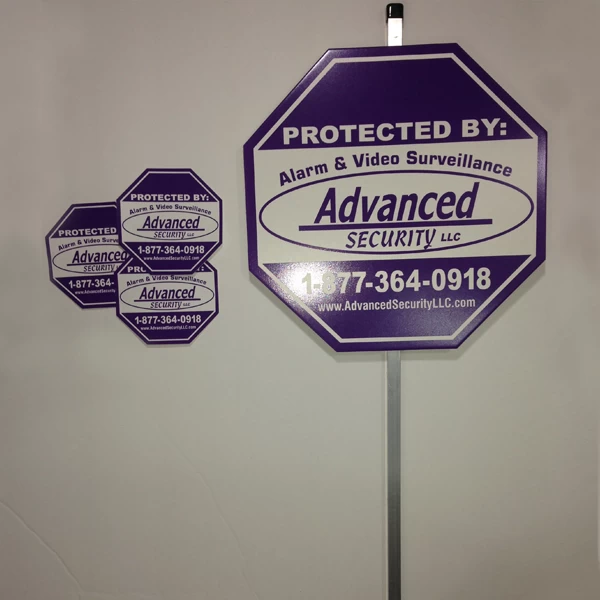 - Security Alarm Sign is an 11″ 3mm PVC Printed with Fade Resistant UV Ink with Adhesive Bonding on the back to mount the sign.