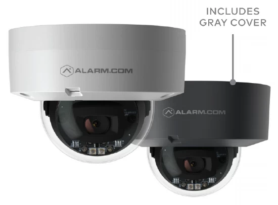 The Alarm.com ADC-VC827P Pro Series 2MP Indoor/Outdoor Dome Camera designed for use in indoor and outdoor environments. The camera comes with a dark gray cover that can be optionally attached to change the appearance of the camera for aesthetic purposes. As part of the commercial Pro Series line, the camera enables intelligent analytics for object detection and business activity tracking. In addition to cloud clip storage, the ADC-VC827P supports 24/7 recording to an optional onboard microSD card and/or the Commercial-Grade Stream Video Recorder (CSVR126).