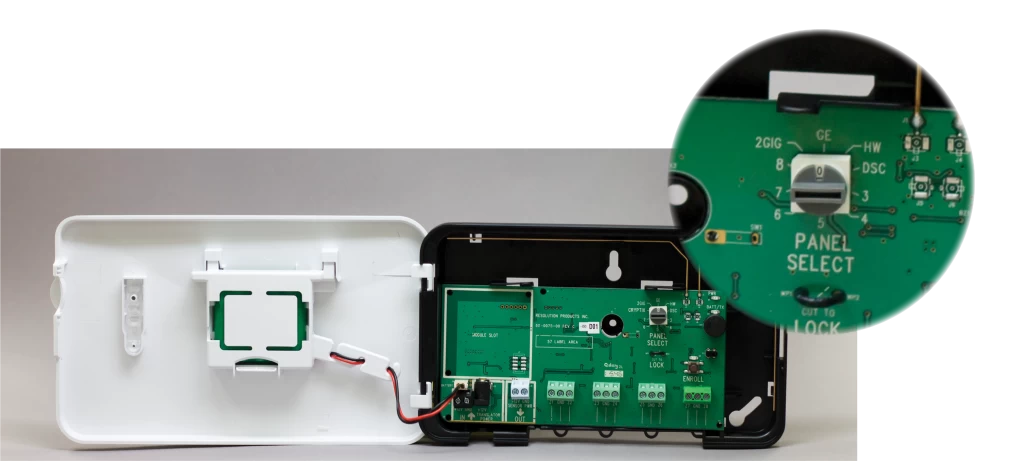 Field configurable RF. Just set the dial to the brand of sensor and the brand of panel being installed. You no longer need a specific model set to the specific manufacturers frequency.